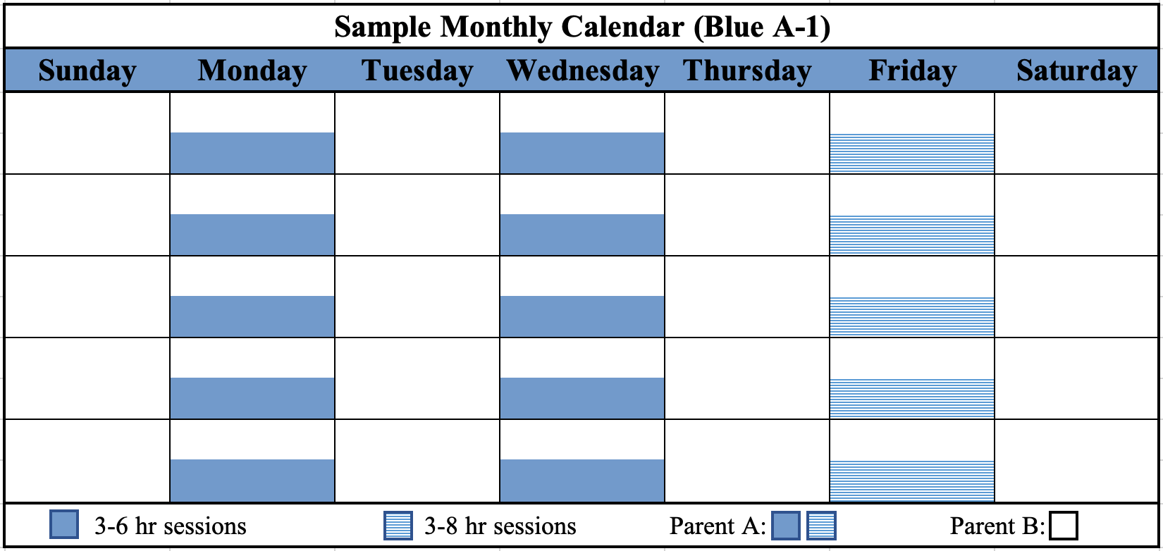 Parent A (the parent with VISITATION rights) will have physical custody of the child(ren) three sessions per week that last [three] to [six] hours each (Sessions A, B, and C). One session per week may last up to [eight] hours, but not overnight. Avoid consecutive sessions, if possible.
