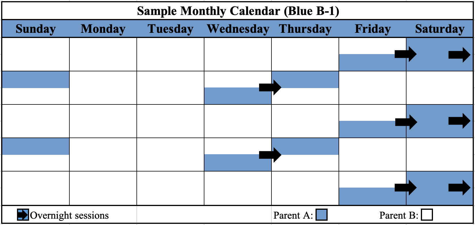 Parent A (the parent with VISITATION RIGHTS) will have physical custody of the child(ren) every other weekend (Session B), as well as one additional overnight session during the intervening week (Session A).