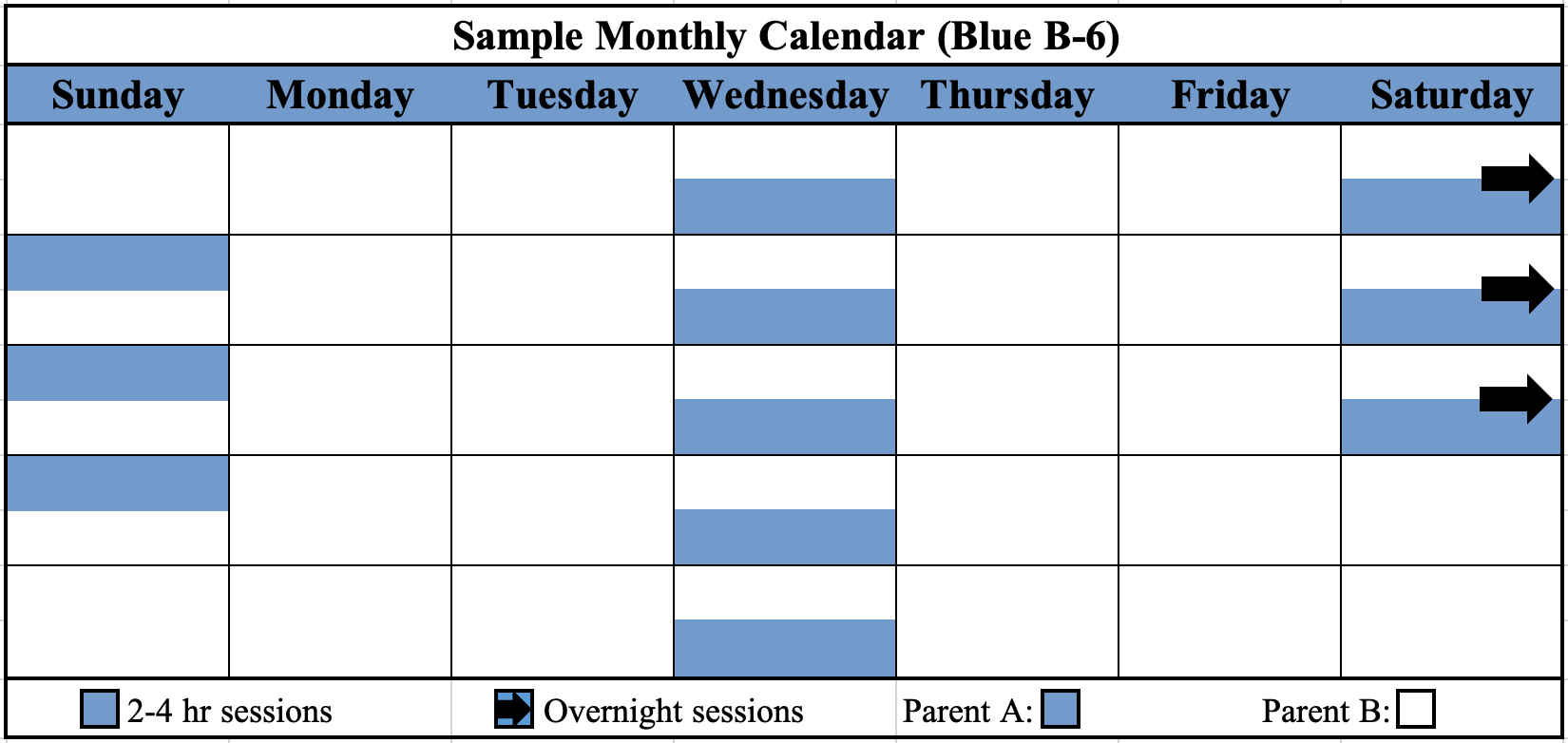 Parent A (the parent with VISITATION rights) will have physical custody of the child(ren) for at least one weekday session per week lasting [two] to [four] hours (Session A). Parent A will also have [one] overnight session on [three] weekends per month (Session B).
