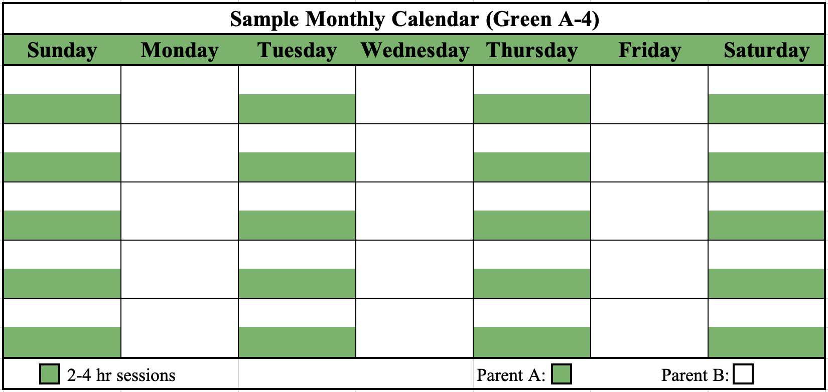 Parent A will have physical custody of the child(ren) for at least four sessions per week lasting [two] to [four] hours, but not overnight (Sessions A, B, C, and D).