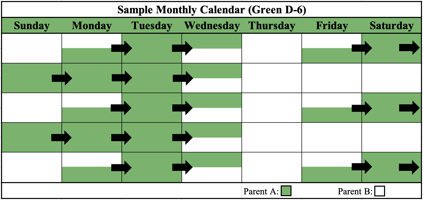 Each week during weekdays, parents will split physical custody of the child(ren) (Session A).
