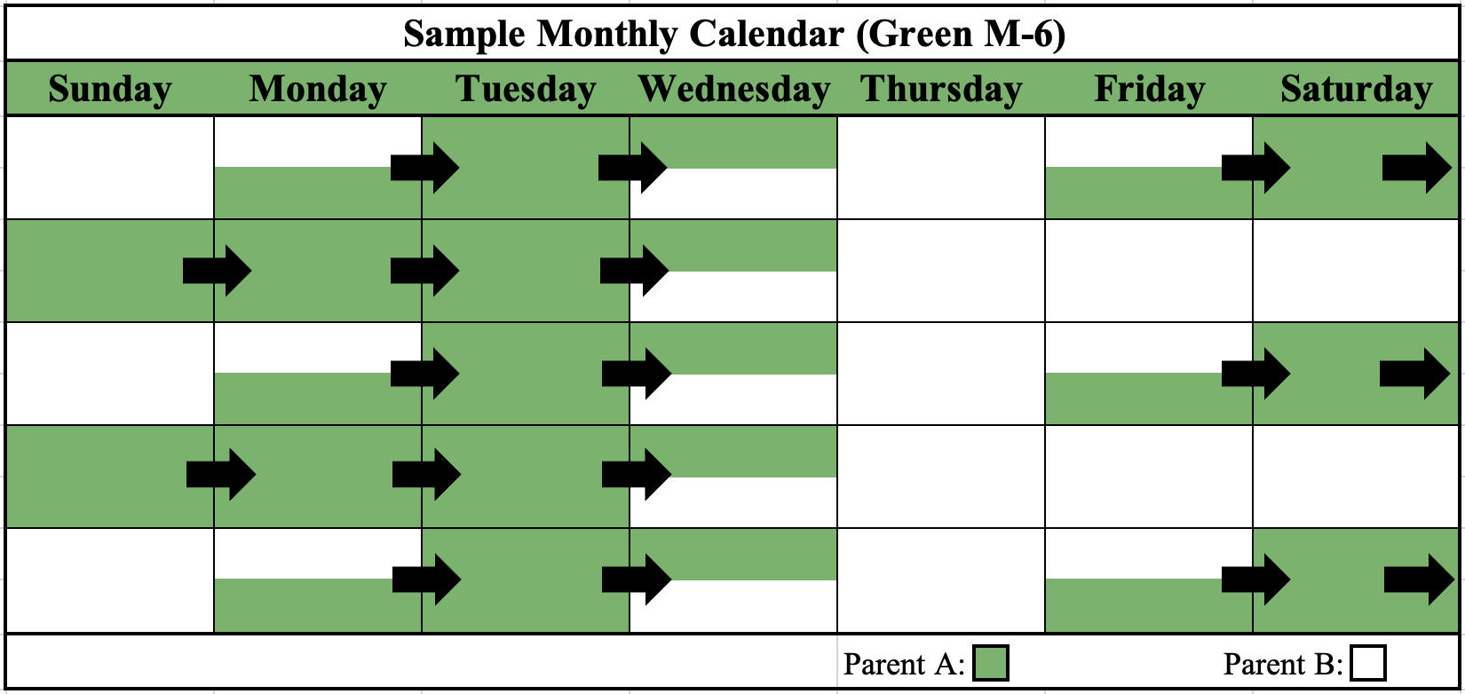 Each week, parents will split physical custody of the child(ren) during the weekdays (Session A).