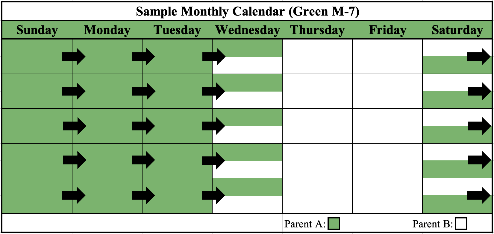 The parents will split physical custody of the child(ren) each week. Options for how the week can be split are on the Green General Time-Sharing Schedule M-7 Form (Options A, B, and C).