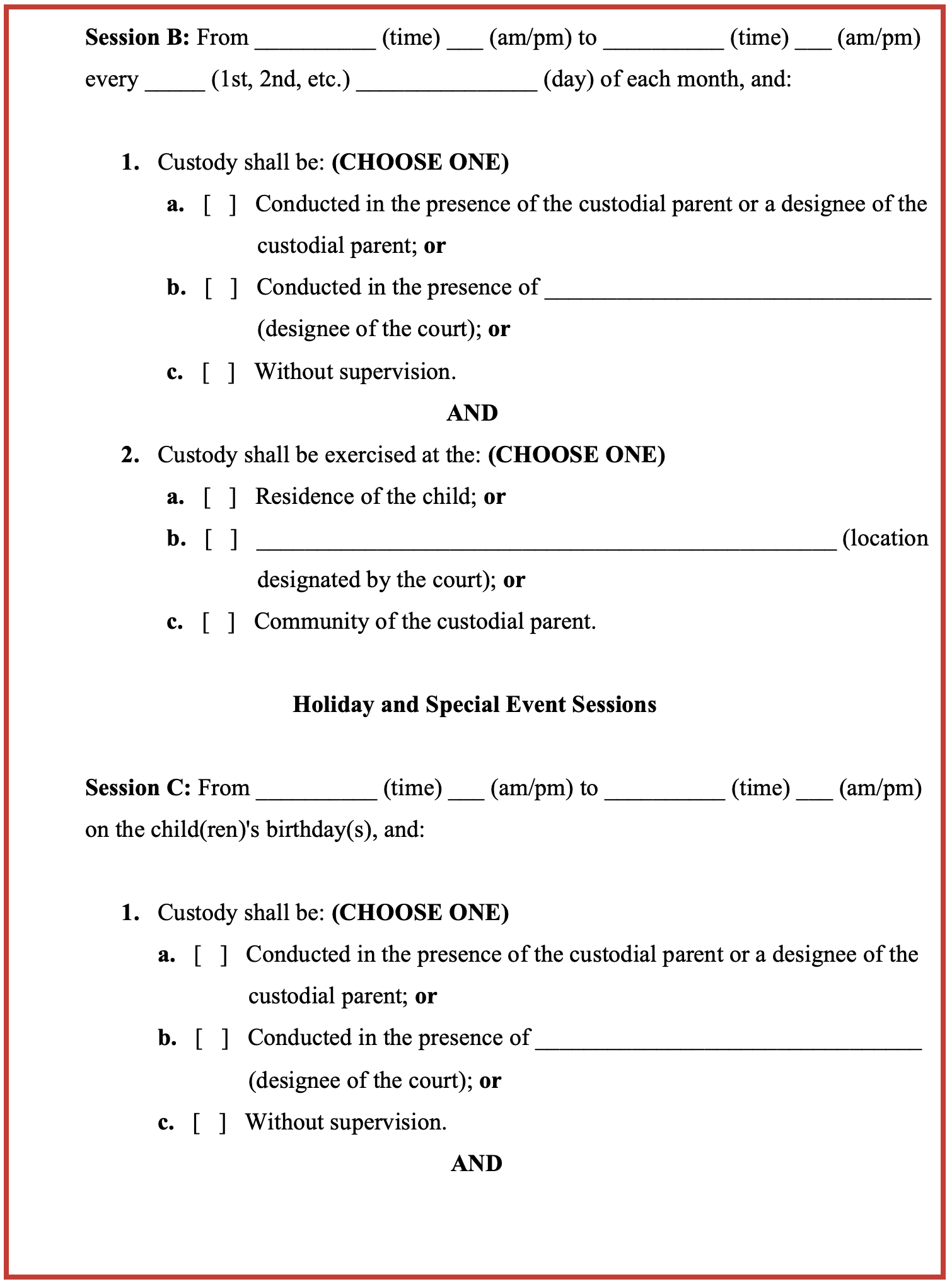 Parent A shall also have physical custody of the child(ren) for [three] hours on the child(ren)’s birthday(s) (Session C), for [three] hours on Christmas Day (Session D), and for [three] hours on either Mother’s Day or Father’s Day (Session E). One additional session per year is included on the Red Schedule 2 Form in case Parent A celebrates an additional holiday or special event (Session F).