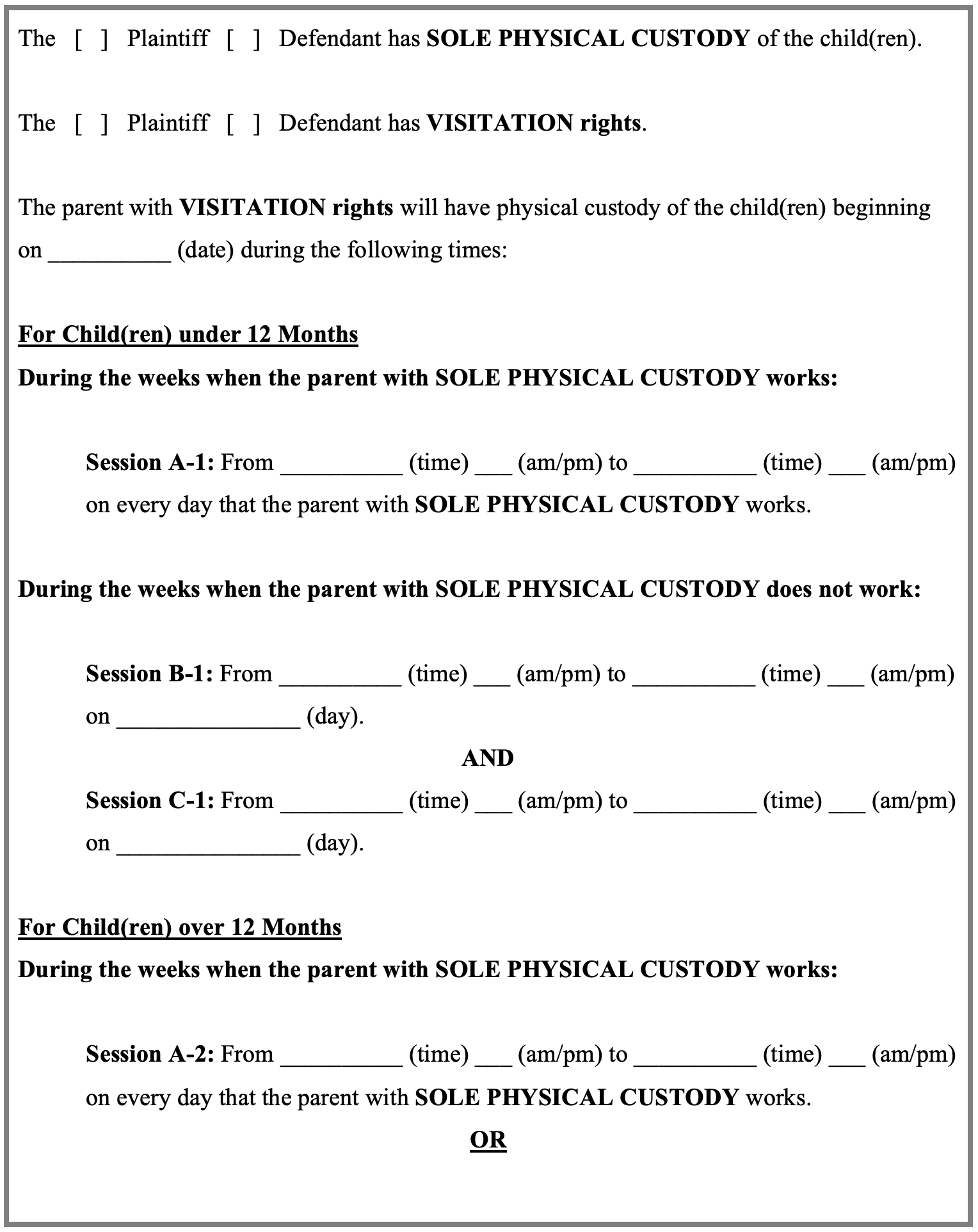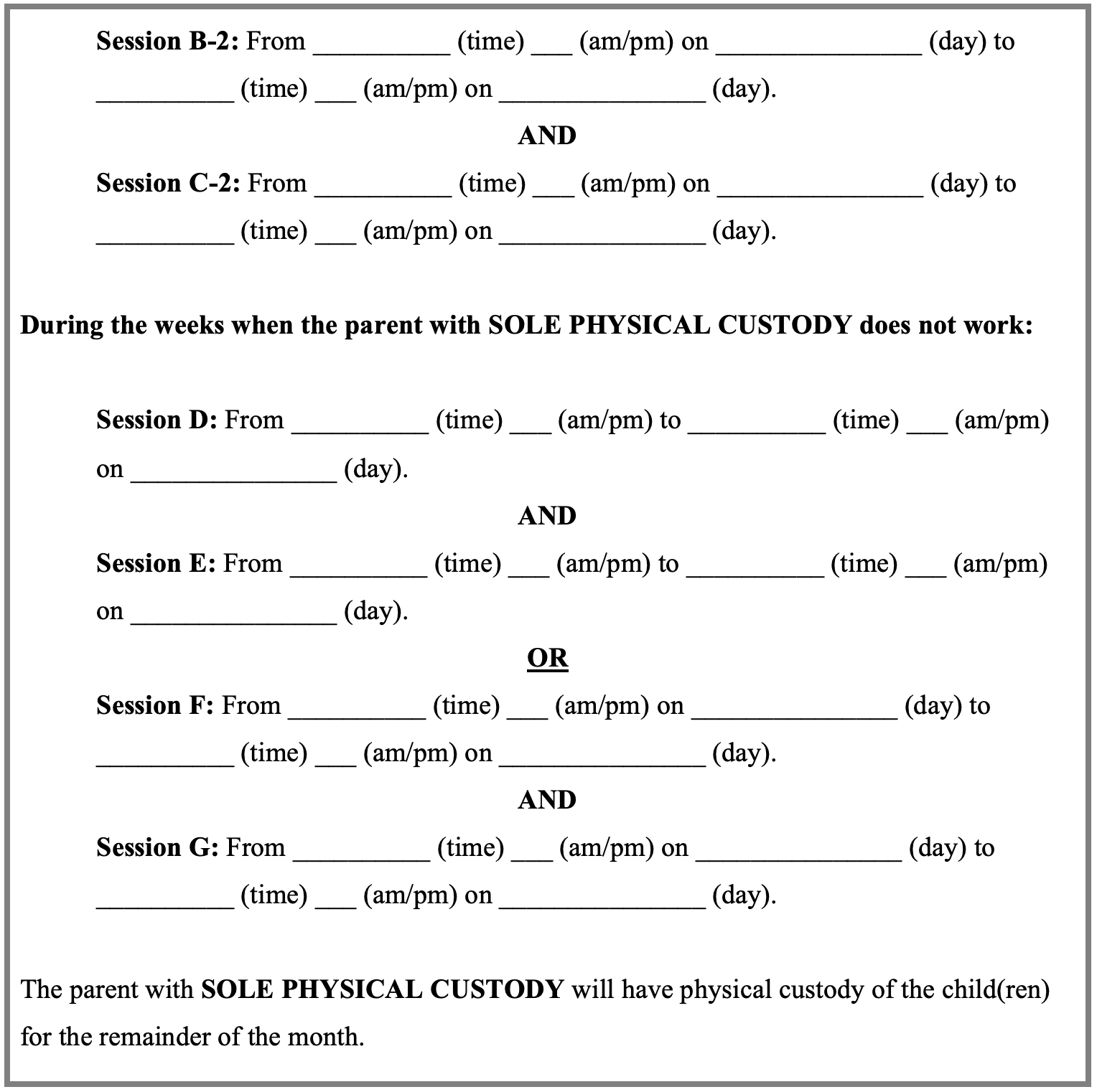 On the week that the Parent B does not work, Parent A will have physical custody of the child(ren) for [two] sessions for [three] to [six] hours per session.